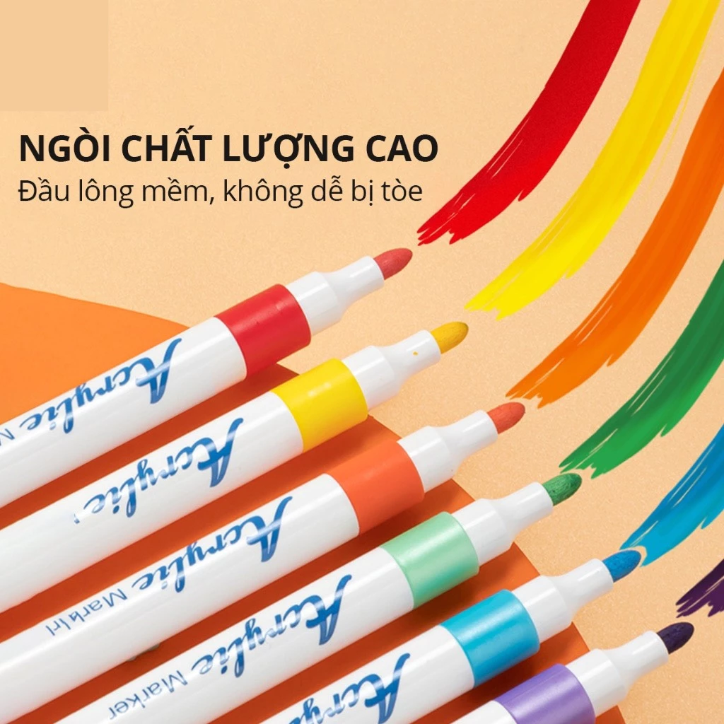 Bút màu Acrylic Marker cung cấp màu sắc tươi sáng, độ bão hòa màu cao, che phủ tốt, giúp bạn dễ dàng chồng màu, vẽ các chi tiết tinh tế mà không lo bị nhòe hay phai màu.
