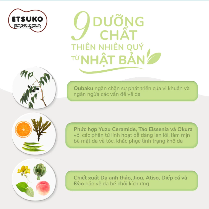 Sữa tắm gội Etsuko được chiết xuất từ Oubaku (vỏ cây Hoàng Bá), dạ anh thảo, dạ jiou, atiso, và đào – các thành phần giúp kháng khuẩn, chống viêm và dưỡng ẩm tối đa cho da bé. -